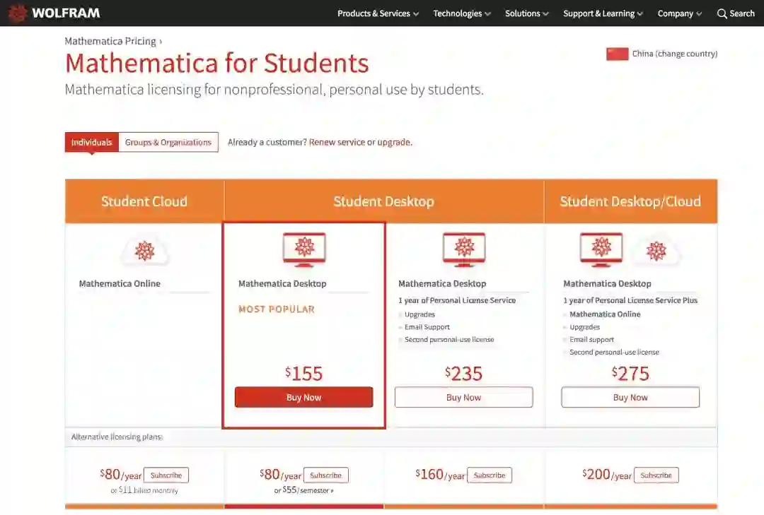 如果你是高中及以上的在校学生,可以点击访问 Mathematica 学生优惠页面,选择你需要的套餐。如果没有特殊需求的话,最低档次的 Mathematica Desktop 应该已经足够使用。