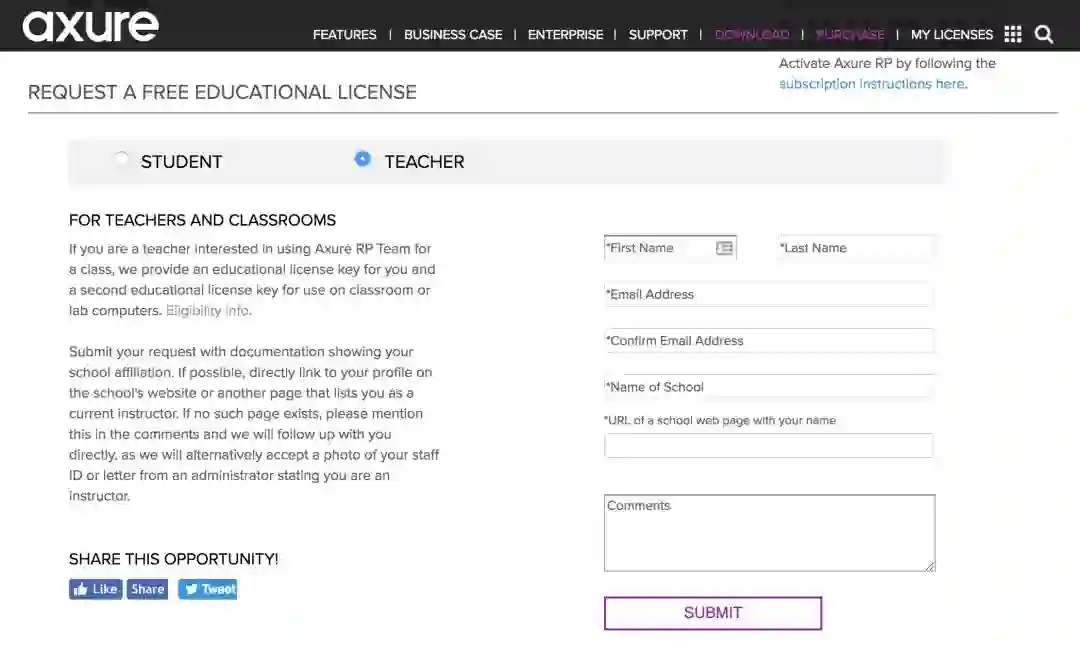 如果你所就职的学校没有类似网页,也可以直接填写学校主页地址,然后在留言中注明情况,Axure 团队会通过邮件单独与你取得联系。你可以回复邮件,并在附件中提供教师资格证、学校官方文件等作为身份证明。