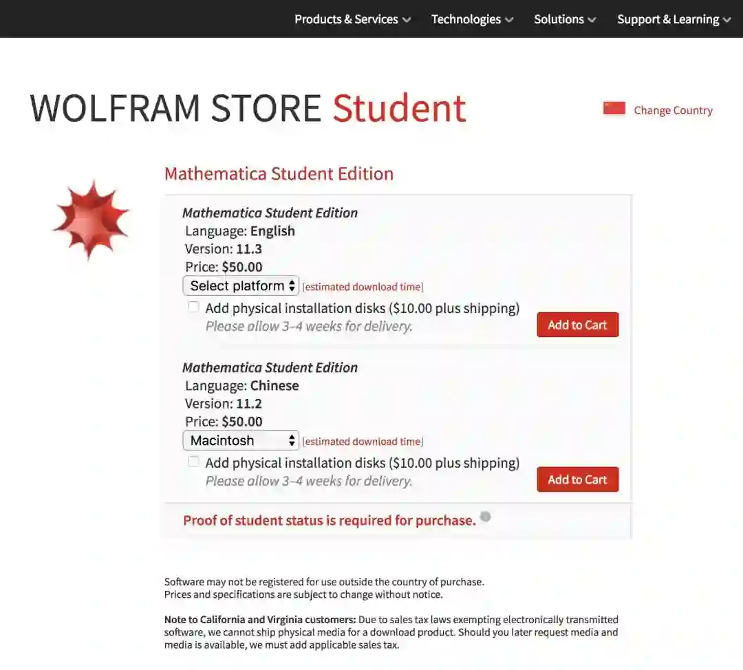 选定套餐,点击 Buy Now 按钮,你就会被重定向至具体配置选择页面。如果你身在大陆,可能会惊喜地发现套餐价格比刚才显示的更低。例如最低档次的 Mathematica Desktop 在外面标价为 155 美元,但实际只需 50 美元就能购买。
