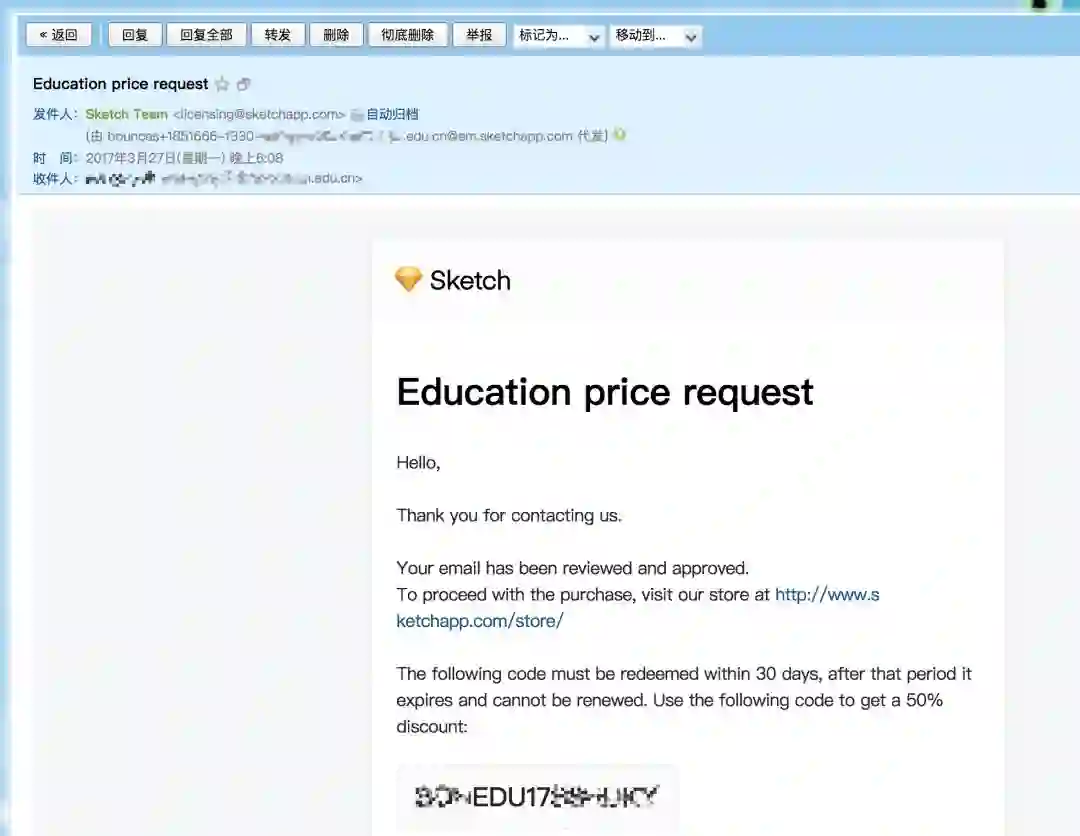 提交表单后,Sketch 团队便会着手进行资质审核,并在通过后为你发来一张专属 5 折优惠券。随后,你只需要访问 Sketch Store,按照正常流程下单,并在结账时输入优惠码便可以了。除了外币信用卡外,Sketch 也支持使用支付宝进行支付,让你无后顾之忧。