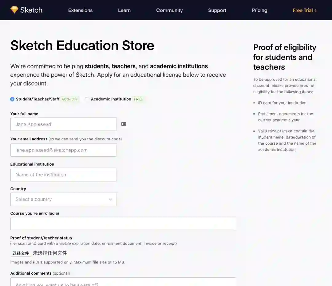 首先,访问 Sketch Education Store 页面,按照提示填写你的姓名、电子邮件地址(推荐使用 .edu 教育邮箱)及其它相关信息。然后,你需要上传自己的学生证或教师资格证的扫描照片或 PDF 文档,上面需要包含清晰的注册时间、毕业日期及与所填写表格中相同的个人身份证明等。