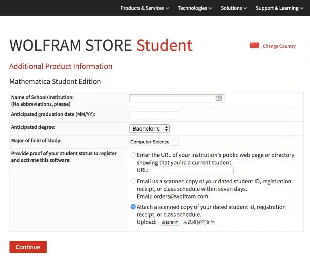 选择好平台和语言,点击 Add to Chart 按钮,网页会要求你提供相关的学生身份证明。如果你所就读学校的官网页面上可以查询到你的姓名和专业等信息,可以直接输入 URL 验证。此外,你也可以提交自己的学生证扫描文档,上面需要包含与表单上所填信息相同的学校、专业、预计毕业日期等注册信息。