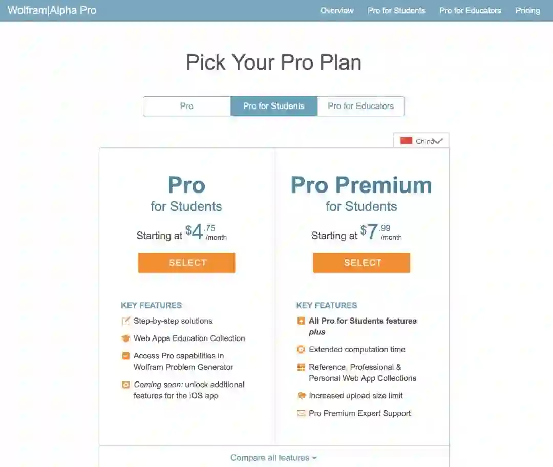 除了 Mathematica 外,Wolfram 公司的另一款知名产品是 Wolfram|Alpha,其可以直接返回复杂算式的答案,主要面向教育领域。由于其基础版一般已经够用,而 Pro 版普通订阅价格和学生并无太大差异(分别是 5.49 美元和 4.75 美元/月),在这里就不详细介绍了,有需要的同学可以访问 Wolfram|Alpha Pro Plan 页面 申请使用。