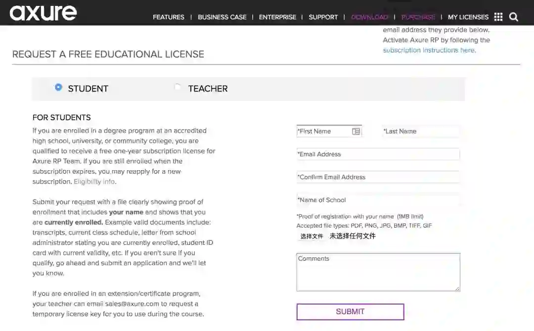 如果你是学生,可以点击访问 Axure 学术计划申请页面,按提示填写你的姓名、电子邮箱地址、学校名称等信息,并上传自己学生证的扫描照片或 PDF 文档,再耐心等待 Axure 团队审核结果就可以了。