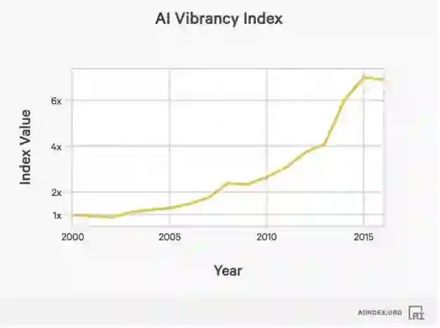 报告还综合学术论文数量、招生数量和VC投资数量,得出AI发展活力指数,数据显示,最新一波AI浪潮在2015年活力最高,自那以后其实活力开始有小幅减弱。