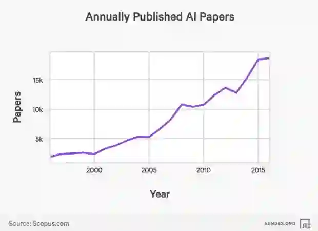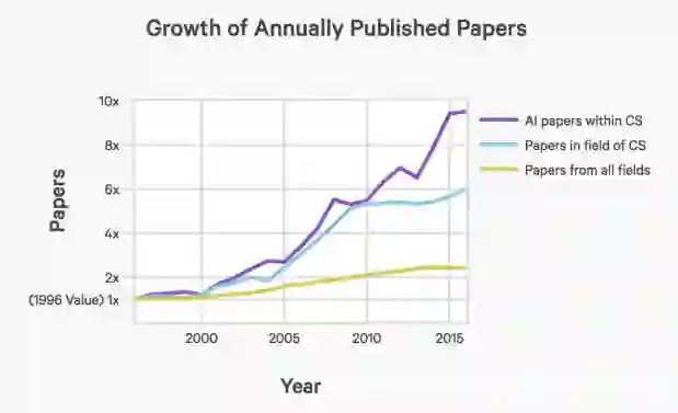 首先,论文发表数量激增:自从1996年以来,每年发表的AI论文数量增加了9倍以上。