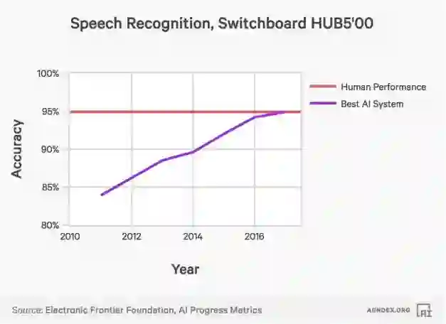 人工智能系统识别语音录音的表现,2016已经达到人类水平。
