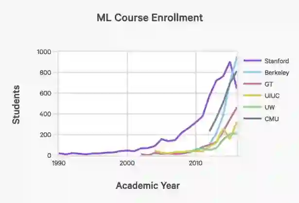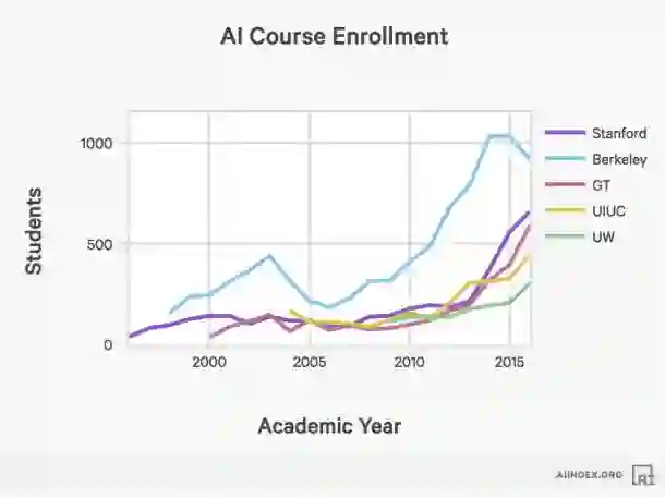斯坦福大学入学选修人工智能和机器学习入门课程的学生人数,自从1996年以来增长了11倍以上。报告指出,由于其他大学的数据掌握有限,因此突出了斯坦福的数据。