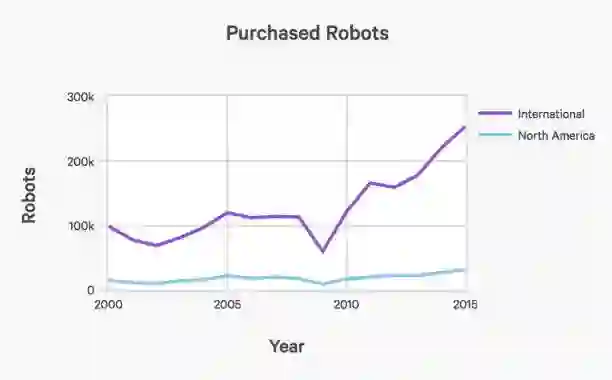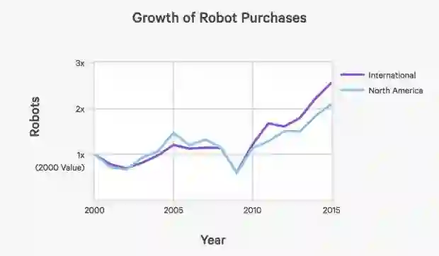 再来看自动化应用的情况,下图展示了北美和全球工业机器人的购买以及购买增幅。工业机器人的使用正在增加。