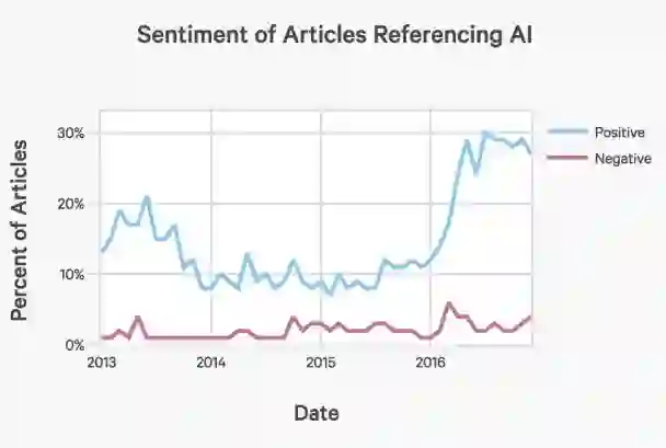 包含术语“人工智能”的主流媒体文章占所有报道的比例,按照正面情绪(蓝线)、负面情绪(紫线)分类: