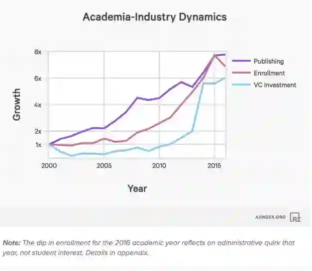 数据显示,最初,学术活动(论文发表和招生)驱动稳步前进。 2010年前后,投资者开始注意到这一趋势,这成为2013年投资者总体活动急剧增加的驱动因素。再后来,学术界逐渐赶上了工业的繁荣。