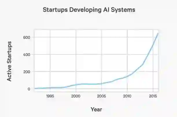 现在将目光转向产业界。下图展示了在美国,有资本支持的AI创业公司数量,从2000年以来增加了14倍: