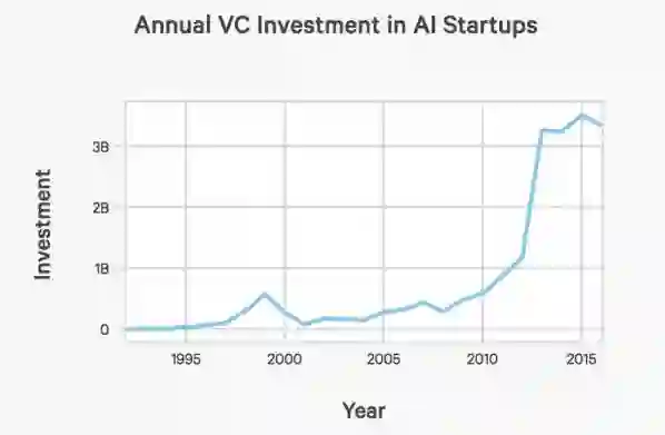 在美国投资AI创业的基金数量也在增长,从2000年以来,每年投入AI创业的资本额增加了6倍: