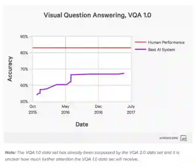 人工智能系统在完成回答有关图像的开放式问题任务上的表现。截止2017年8月,最好的AI系统准确率还不到70%,而人类水平在85%左右。