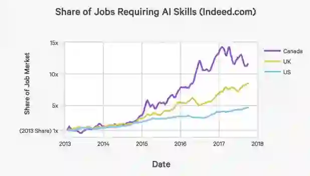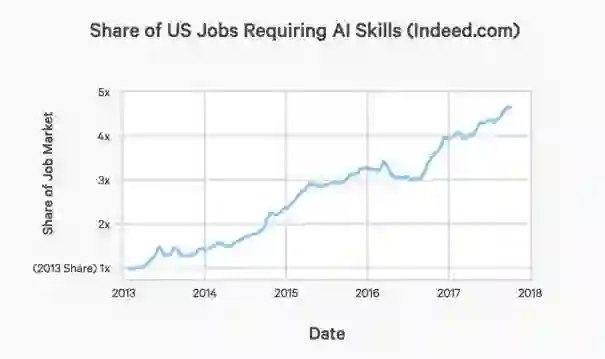 而在美国,需要AI技术的工作岗位,在职业市场所占份额,从2013年到现在,有了4.5倍的增长。