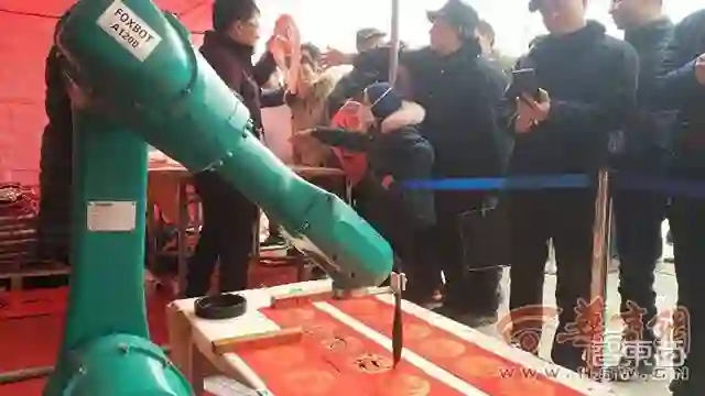 只见那个白色机器人“手握”毛笔,先有节奏感的左右蘸墨,然后转动“手臂”在红纸中间慢条斯理的写下“吉祥如意”四个大字,然后在用小号毛笔签名,最后盖上印章。旁边绿色机器人在写一幅对联,同样是连贯地蘸墨、“手臂”驱动这笔尖勾画、转折、停顿,但动作较慢,像一位慢条斯理的“老爷爷”。据称机器人完成一幅春联需用时15分钟左右。