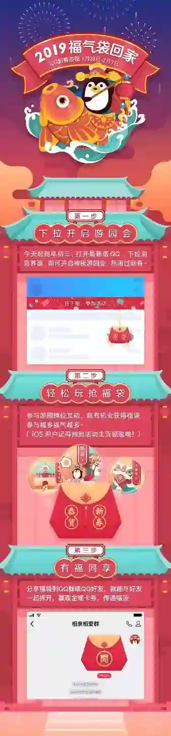 QQ 福袋从 1 月 28 日小年夜开始,一直持续到 2 月 7 日大年初三,主题为“福气袋回家”。“新春游园会”包含以舞狮为核心的“穿越福城”、以窗花为核心的“天降福运”、以接灯笼为核心的“灯笼高高挂”。