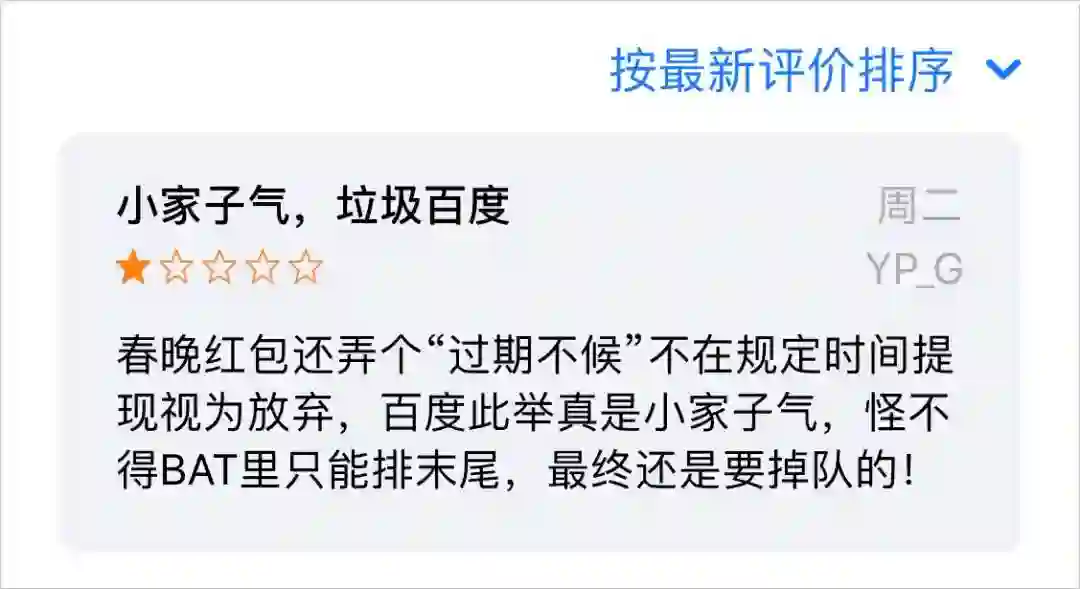 从数据来看,春节红包确实带来了出奇的效果,但用户口碑却不见得好,尤其是百度,明明掏出 10 个亿给用户,最终反被骂惨了。