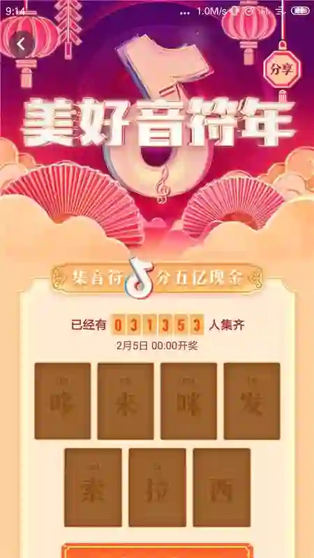 “集音符”活动从 1 月 28 日 14:00 起,至 2 月 5 日 00:00 开奖,用户需要收集“哆、来、咪、法、索、拉、西”七种音符,才能参与瓜分 5 亿红包。