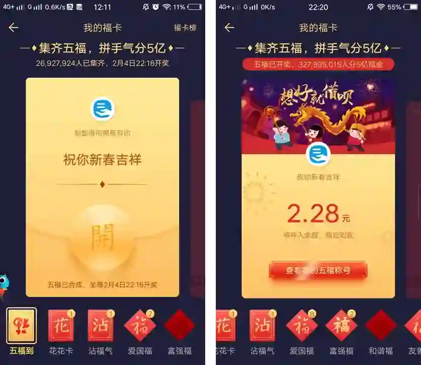 一时间不少人一边抱怨“轻轻松松就能得到的五福没有灵魂”,一边却又心心念念守着开奖的时间。奖项开启,红包金额大多为 2.28 元、1.68 元这样的的小额度。
