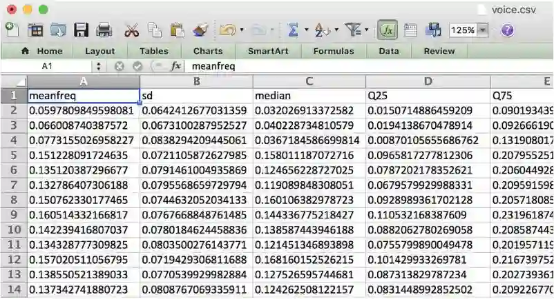 那么你如何从音频里识别语音?如果你下载了该数据集并查看 voice.csv 文件,你将只会看到一行又一行的数字: