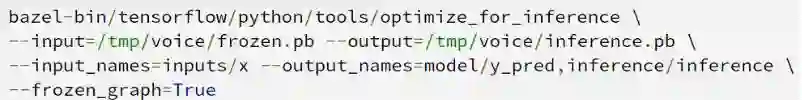 optimize_for_inference 工具将进一步简化图,它将 frozen.pb 文件作为输入,写入 /tmp/voice/inference.pb 文件作为输出。这个输出文件就是我们将要嵌入在 iOS 应用程序中的文件,使用如下命令运行此工具。