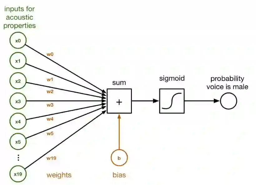 这就是使用 logistic 回归进行二值分类的思想。分类器的输入由描述音频录音的声学特征的 20 个数字组成,我们计算加权和并采用 sigmoid 函数,我们得到的输出是说话人是男性的概率。