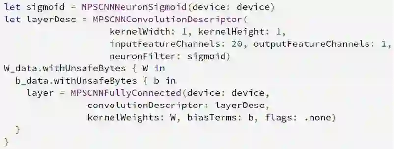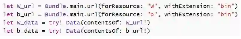 注:对于我们简单的分类器,W 是一个 20 x 1 的矩阵,它仅包括了 20 个浮点数。对于更加复杂的模型,你模型的参数可能会是一个 4D 的张量。这种情况下,你将不得不对其中的一些维度做变换,因为 TensorFlow 中的数据存储形式与 Metal 的数据存储形式不一样。这可以通过简单的 tf.transpose() 命令来实现,但是这对于我们的分类器而言是不需要的。