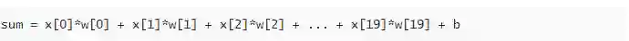 在 sum 块内,由 x0 - x19 给出的输入及其连接权重 w0 - w19 的权重被简单的加在一起。这就是一个常规的点积: