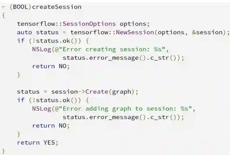 该 C++ API 支持的操作比 Python API 支持的操作少。在这里,在我们损失函数结点的 L2Loss 操作在 iOS 上是不可用的。这就是为什么我们使用 freeze_graph 来简化我们的图的原因。在加载图后,我们开始启动会话:
