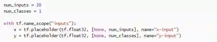 首先,我们定义输入数据张量 x,该张量的形状为 {1,20},即 1 个样例,20 个特征。然后将我们的数据从数组转换成 TensorFlow 中的张量。