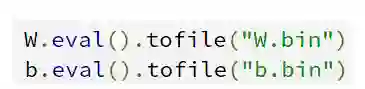 W.eval() 用于计算当前的 W 值,并以 NumPy 数组返回(这与 sess.run(W) 所做的事情一样)。然后,我们使用 tofile() 将 Numpy 数组保存为二进制文件,这就是我们需要做的事情。