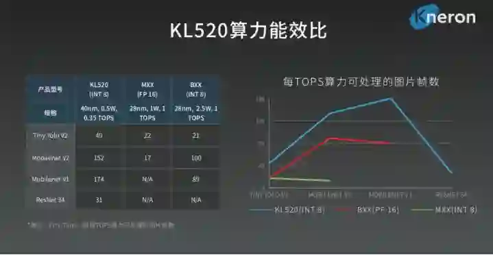 在算力能耗比方面,耐能二代KL520对比市面上较为经典的架构,能够提升3-4倍。