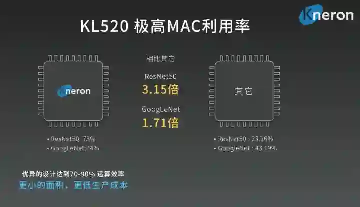 KL520 算力峰值为0.39TOPS (300MHz) 。相比主流AI芯片的理论算力峰值 1-2TOPS,KL520 看起来并不占优势。不过由于核心利用率(MAC利用率)达到竞品的2-3倍,使其实际效果达到与1TOPS的相近水平,同时保持极低的功耗和成本。