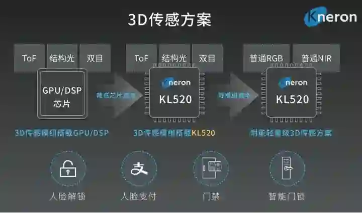 为应对3D摄像头模组贵、芯片成本高、硬件功耗高等3D传感行业痛点,耐能通过和奇景光电、高通合作推出轻量级3D传感方案,将传统的3D传感模组ToF/结构光/双目+GPU/DSP芯片方案简化为,普通RGB摄像头+普通NIR(近红外光)+KL520,在芯片和模组两个层面降低成本。