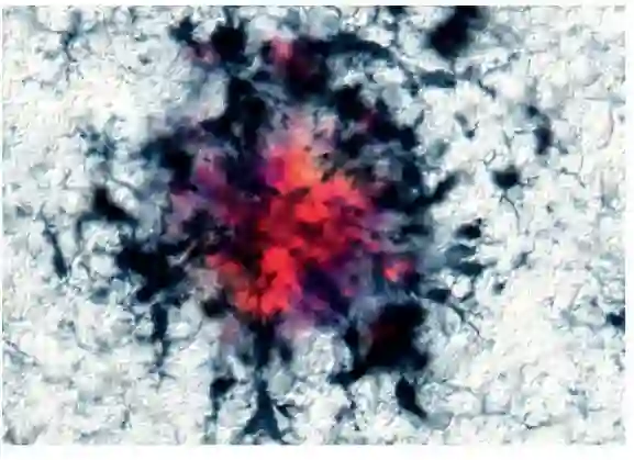 阿尔兹海默症小鼠模型中,大脑中斑块附近聚集着大量小神经胶质细胞。