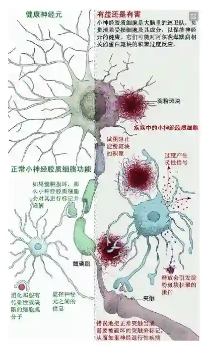 针对小鼠和人类尸体的大脑进行的两项研究表明,聚集在大脑斑块周围的小神经胶质细胞非常特殊。相比于常规小神经胶质细胞,它们的部分基因被上调或下调。这些基因模式提示,这类小神经胶质细胞似乎试图上调其看家功能,以对抗斑块。其中一些基因移除了免疫细胞的检查点,从而激活细胞。其它基因则增强了细胞感受损伤的能力,或增强了细胞吞噬有缺陷分子的能力。在每种情况下,基因表达模式都表明小神经胶质细胞正在加强自身的防御功能,以保护大脑。