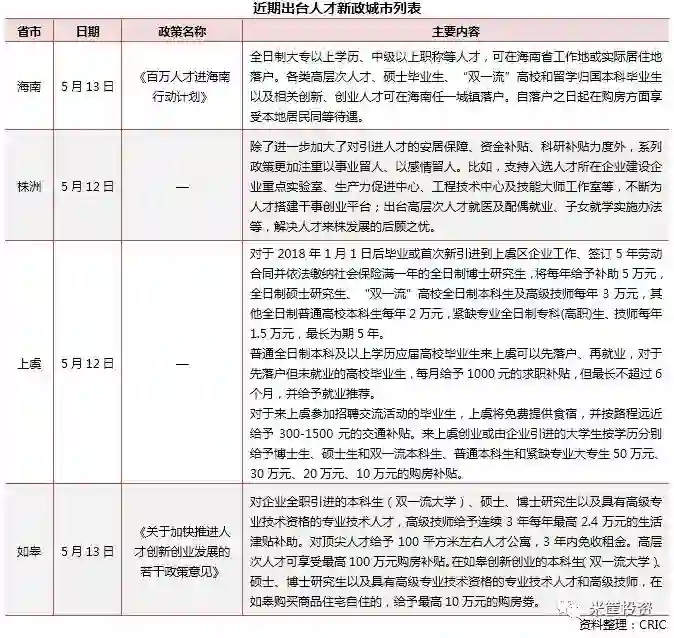 5月16日,天津发布“海河英才”人才引进行动计划,不超40岁的本科生、在天津工作满1年的大专生、创办企业运行1年并缴税10万以上的创业人才,无需其他条件均可直接落户。