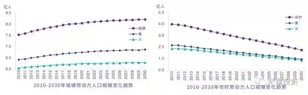 因此,在未来劳动力缺口将会越来越大。与此同时,随着城镇化率走高,城镇劳动力在增加,而农村劳动力正急剧减少。
