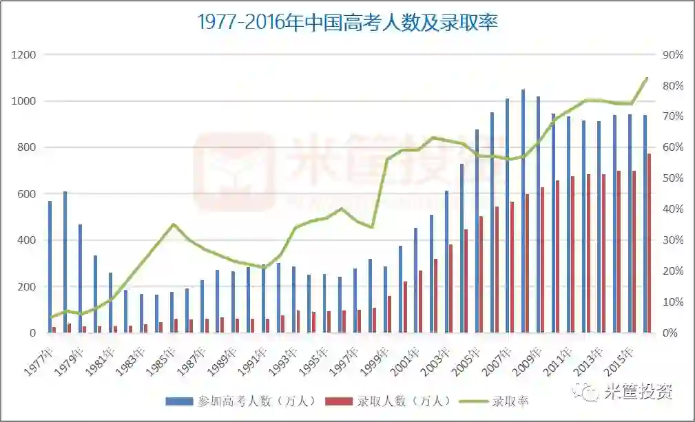 1999年开始的高校扩招,让全国大学生数量爆发式增长。2008年,全国参加高考人数达到1050万人的顶峰,从此之后便一路下降。但录取率一直飙升至82%,让实际录取为大学生的人数每年都创下新高。