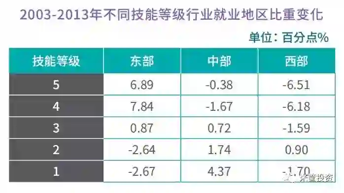 从地区分布上看,高技能人才正快速向东部聚集,低技能人才向中部省份流动,而西部各项人才都流失较多,这也是近十几年来人才用脚投票的结果。