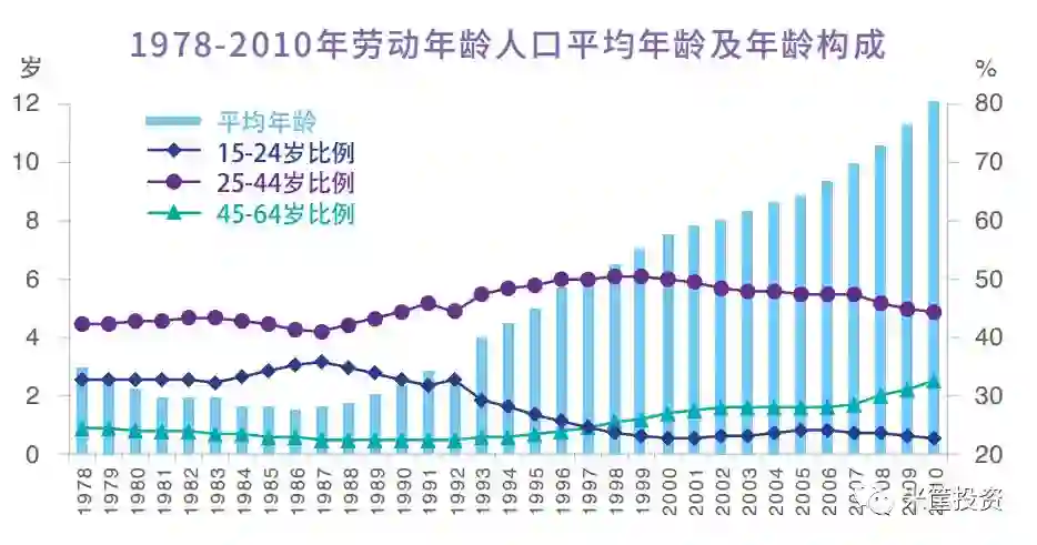 从上图可见,中国劳动年龄人口的平均年龄从1978年的34岁下降到1986年的33.5岁,然后逐渐提高到2010年的38岁。预计到2030年,45岁到64岁的劳动力占比将提升至44%。
