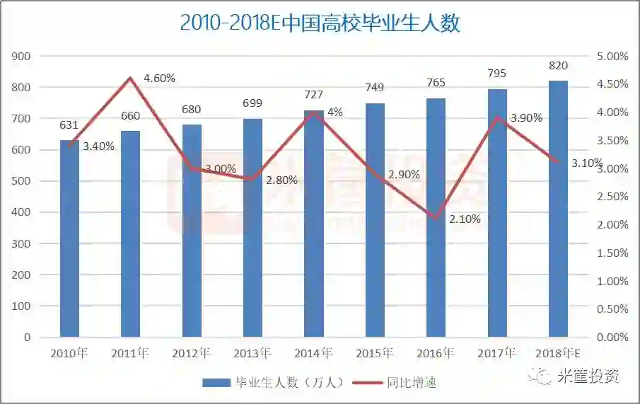 与之对应,每年高校毕业生人数也屡创新高,2018年,预计将有820万毕业生涌入就业市场。大学生的需求最大,供给增长幅度也是最大的,“遍地都是大学生”已是常见现象。