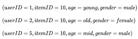 LR这个模型解释性是非常强的。我们还是举上面图中的那个例子,我们有四种特征,user ID,item ID,年龄,性别。假如在分布均匀的茫茫负样本中,只有三个正样本,分别是: