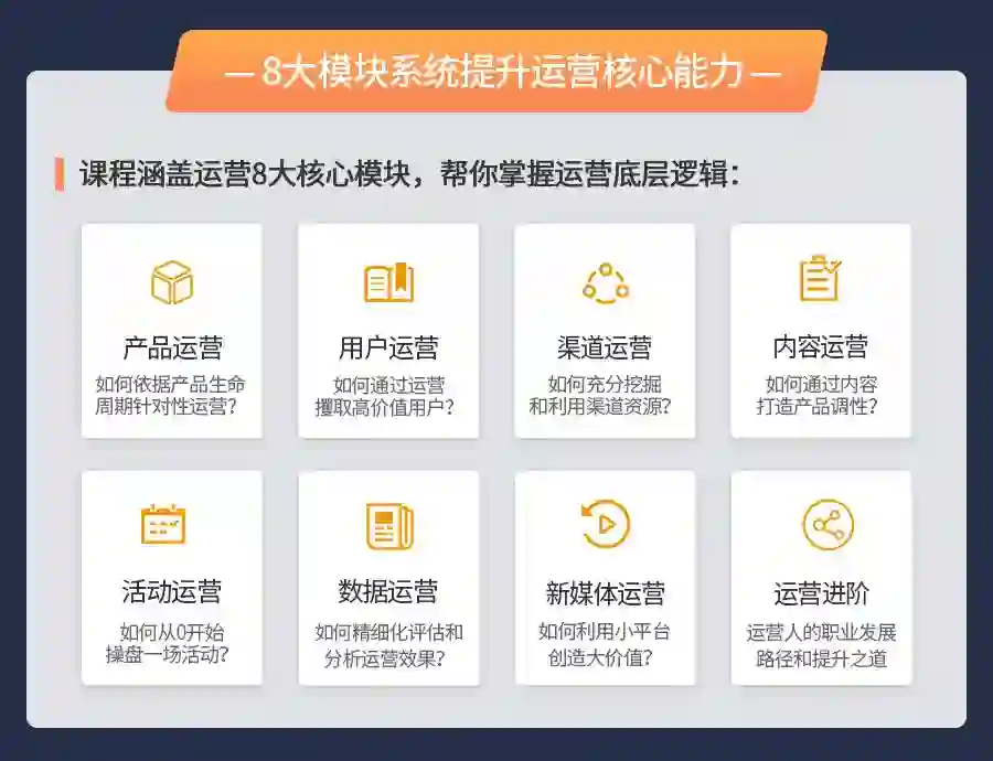 而我们的课会基于产品、用户、渠道、内容、活动等核心运营模块展开,让你掌握做运营的整体方法与框架思维。