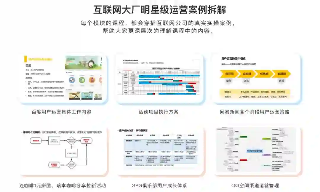 而大案例均为导师在腾讯、网易等一线互联网大厂经历/操盘过的真实运营项目,旨在于带你还原真实的运营工作全貌。