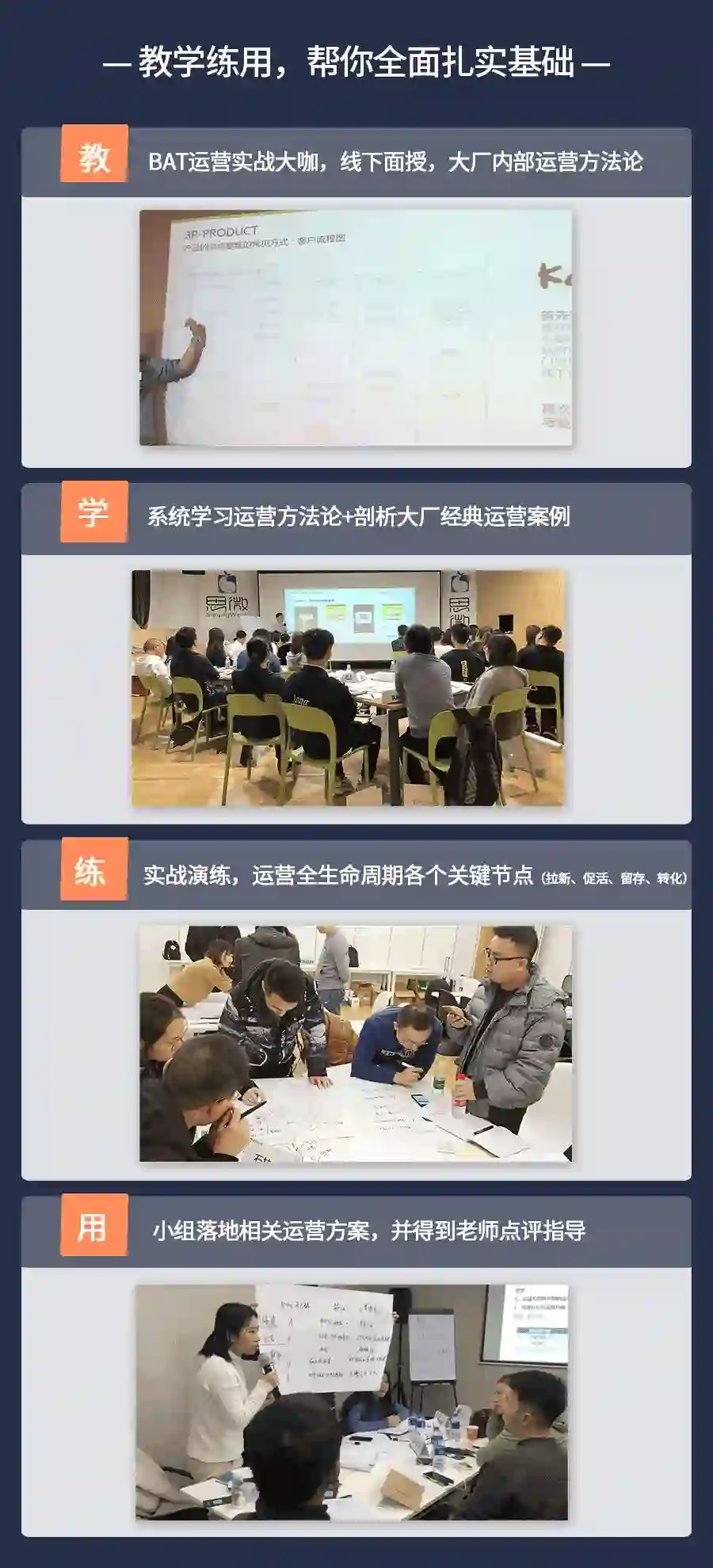 另外考虑到线下课程涵盖整个运营体系,内容非常烧脑,针对吸收不充分的同学,我们还提供了线下复训的额外福利。
