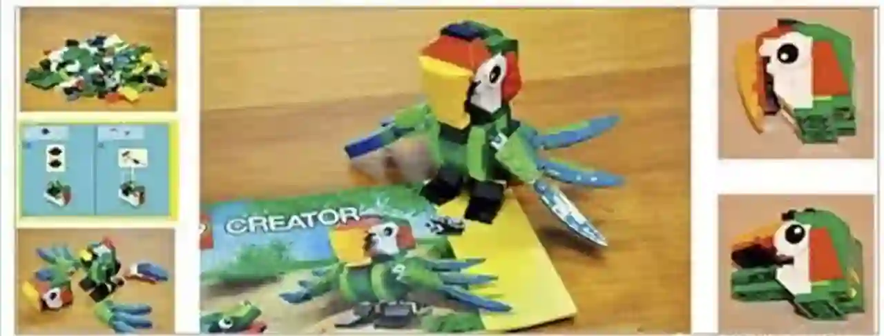 因为这篇小说的特殊性,星新一奖组委会也曾发信给佐藤教授询问:“最终写文章的是您,还是您的计算机?”佐藤教授表示:“这个问题很难回答。”因此,他做了一个比喻。如果一个人按照说明书,把乐高的积木块拼起来,成为一只鹦鹉(见图2),请问是谁做了这只鹦鹉?也许您会说:“是你组装的,不过不是你创造的。”实际情况可能会更复杂。事实上,人类做了零件(例如,描述某种天气具体的短语),怎样去组装也是人类来做的(例如,人写了故事除了部件以外的部分),按照这个说明,机器最终完成了组装(为每个部件生成具体的句子),生成了小说。但是组合的方法有很多,很自由。例如,鹦鹉的嘴巴也可能做成别的样子(见图2右侧)。使用他们的程序,可以做出成千上万种不同的小说来。