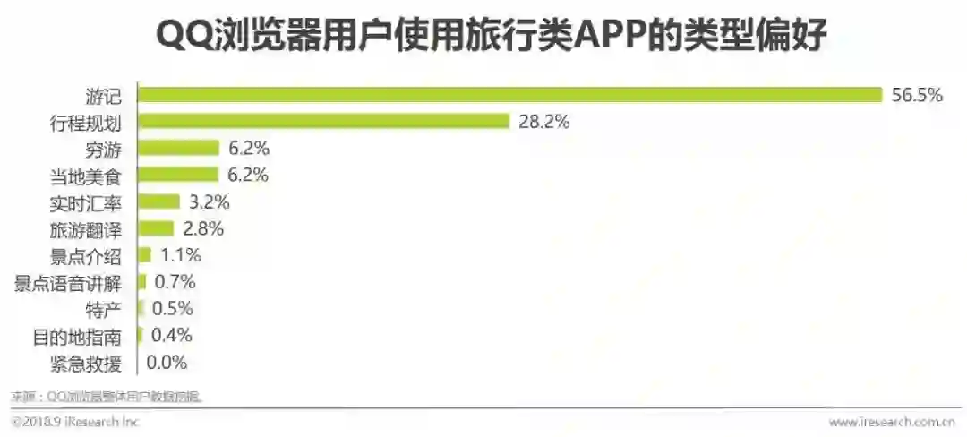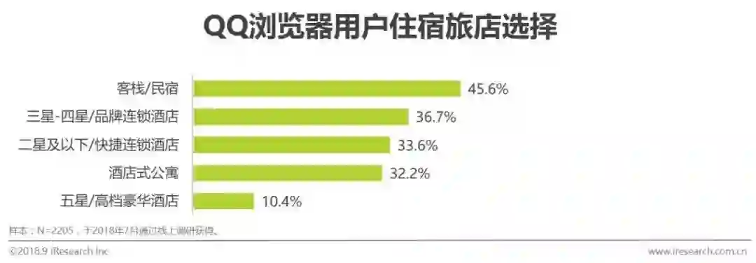 QQ浏览器用户手机里游记类旅行APP很受欢迎,他们喜欢关注他人体验式经历分享,感受并记录旅行过程中美景和经历,享受旅行的过程。从旅行住宿来看,客栈民宿等非标酒店成为QQ浏览器用户外出旅行的优先住宿选择,占比45.6%;相比常规性酒店,客栈/民宿是更能体会到当地风土人情的住宿方式,体验性更强,受到用户们的偏爱。