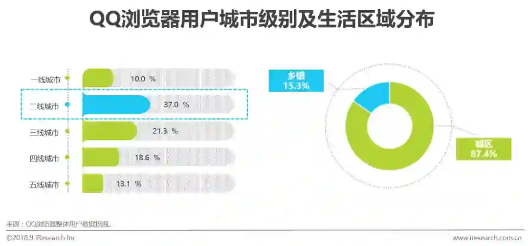 84.7%的QQ浏览器用户是城市居民,分布在国内各级别城市,其中以二线城市居民相对更多,占比37.0%。从城市发展来看,二线及以下城市在社会消费品零售总额、城市居民可支配收入和消费支出等维度上相对不及一线城市,但这些城市居民生活相对平稳安逸,生活节奏适中,工作压力相对更小。